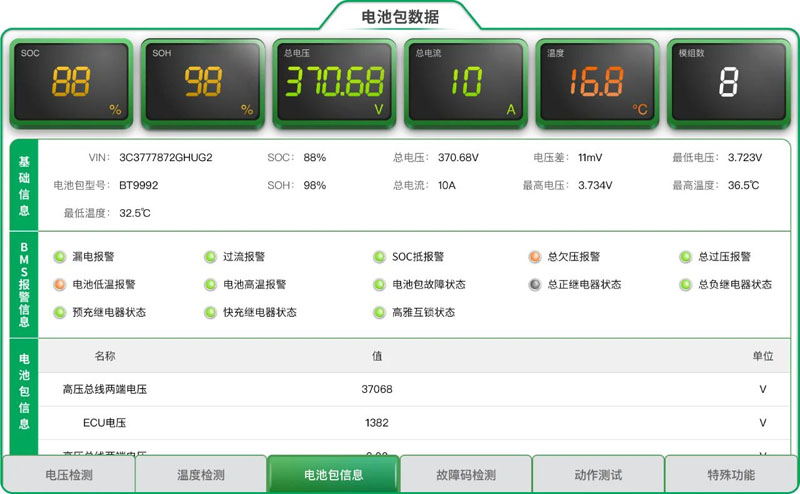 检测电池包内各模块信息、当前运行整体状态及故障信息,便于维修人员快速判断故障点;